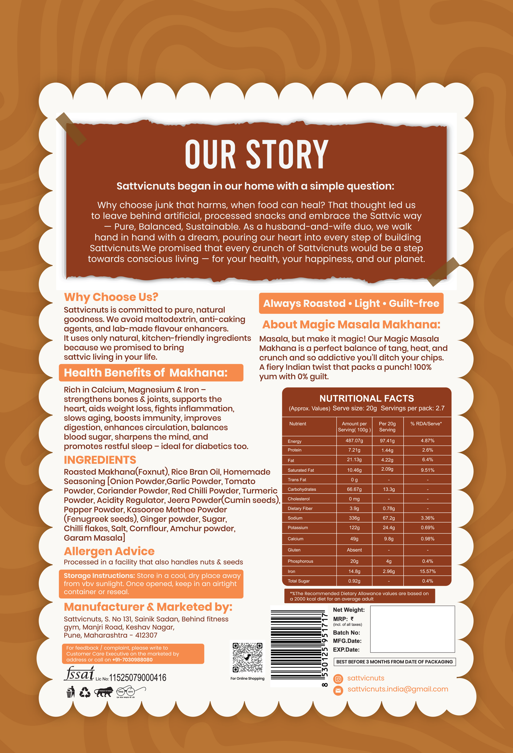 Masala, but make it magic! Our Magic Masala Makhana is a perfect balance of tang, heat, and crunch and so addictive you’ll ditch your chips. A fiery Indian twist that packs a punch! 100% yum with 0% guilt.