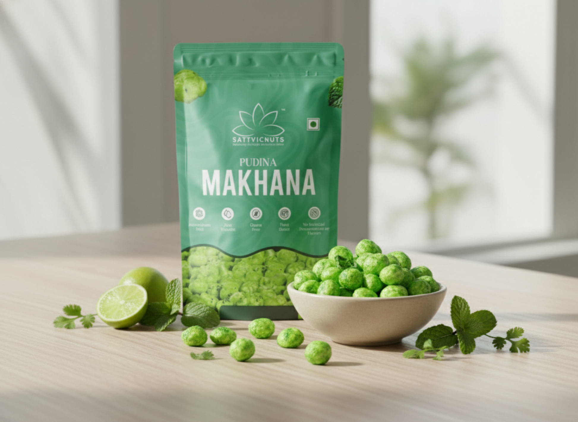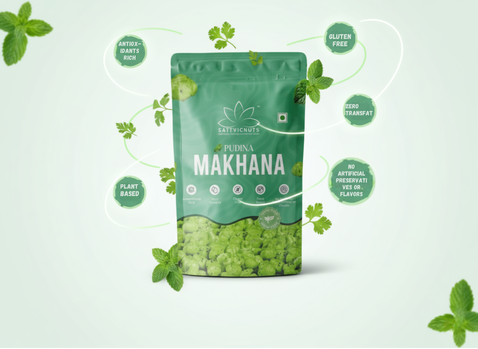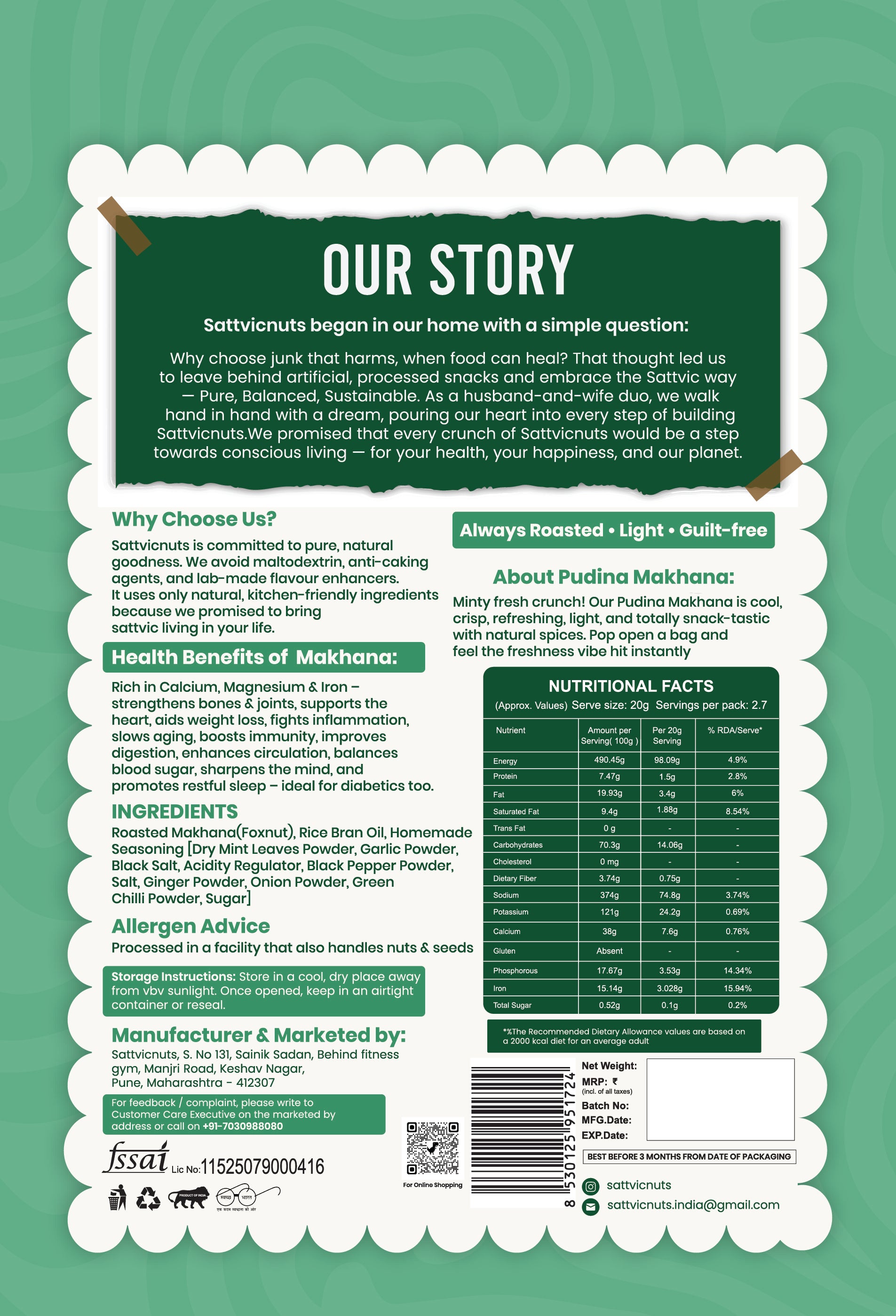 About Pudina Makhna: Minty fresh crunch! Our Pudina Makhana is cool, crisp, refreshing, light, and totally snack-tastic with natural spices. Pop open a bag and feel the freshness vibe hit instantly.
